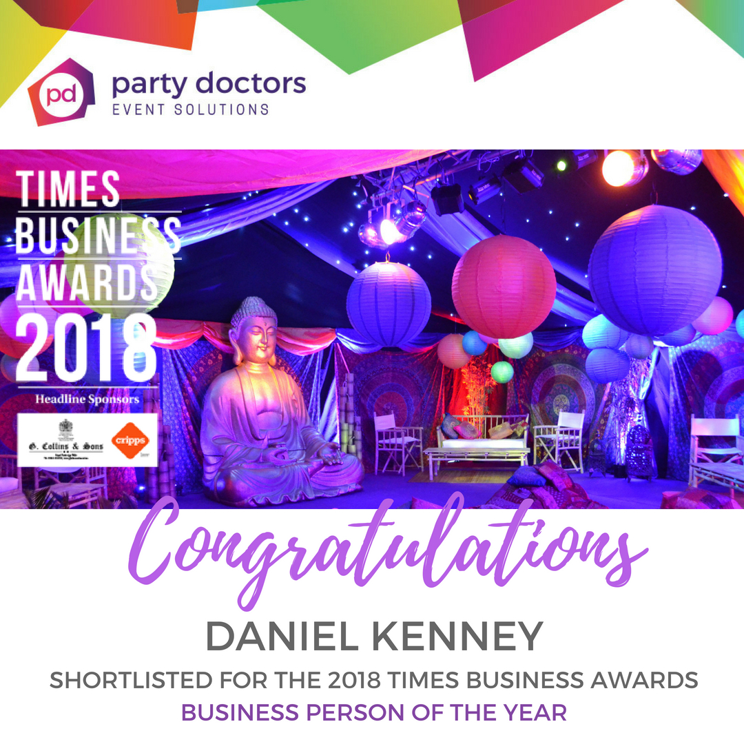 We are super proud to see that Dan Kenney, our boss man, leader and mentor has been shortlisted for 'Business Person of the year' without a doubt, Dan is the most creative, talented, inspiring, hardworking and supportive leader we could ever ask for. Now, let's hope the judges recognise this and we add another award to the cabinet here at Party Doctors HQ.