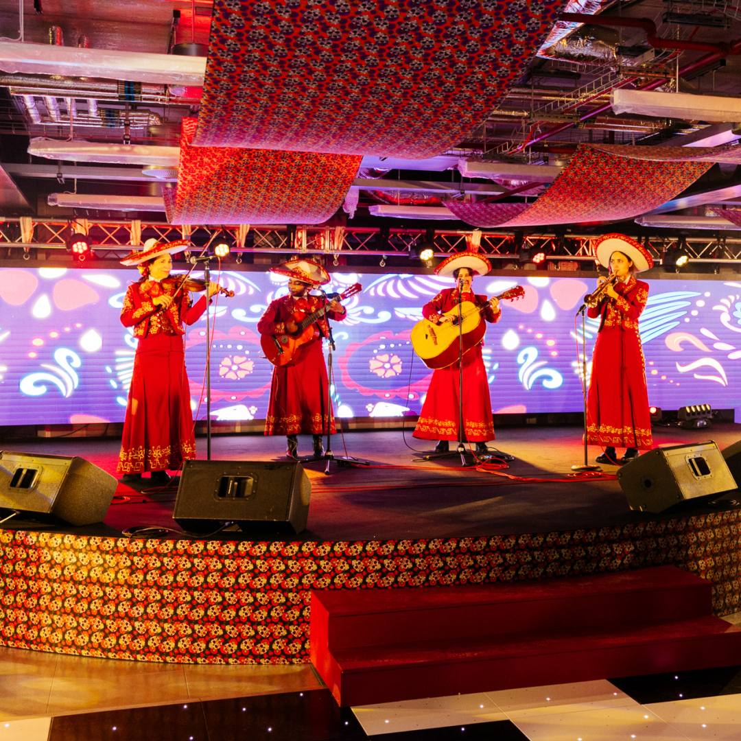 The event featured a striking half-round stage, hosting a live all-female Mariachi band alongside a DJ, supported by full technical production. Tequila bars, theatrical props, curated cocktails and exceptional catering from Mestizo combined to create a rich, energetic atmosphere, while sensitive installation ensured the integrity of the unfinished space was maintained throughout.